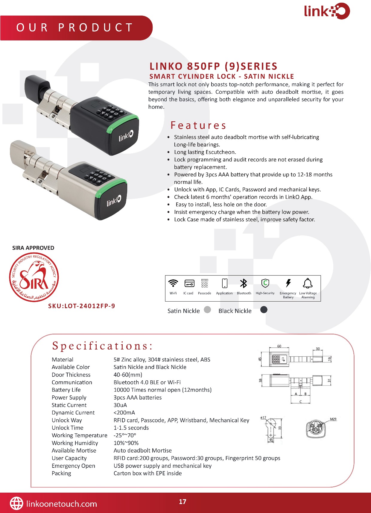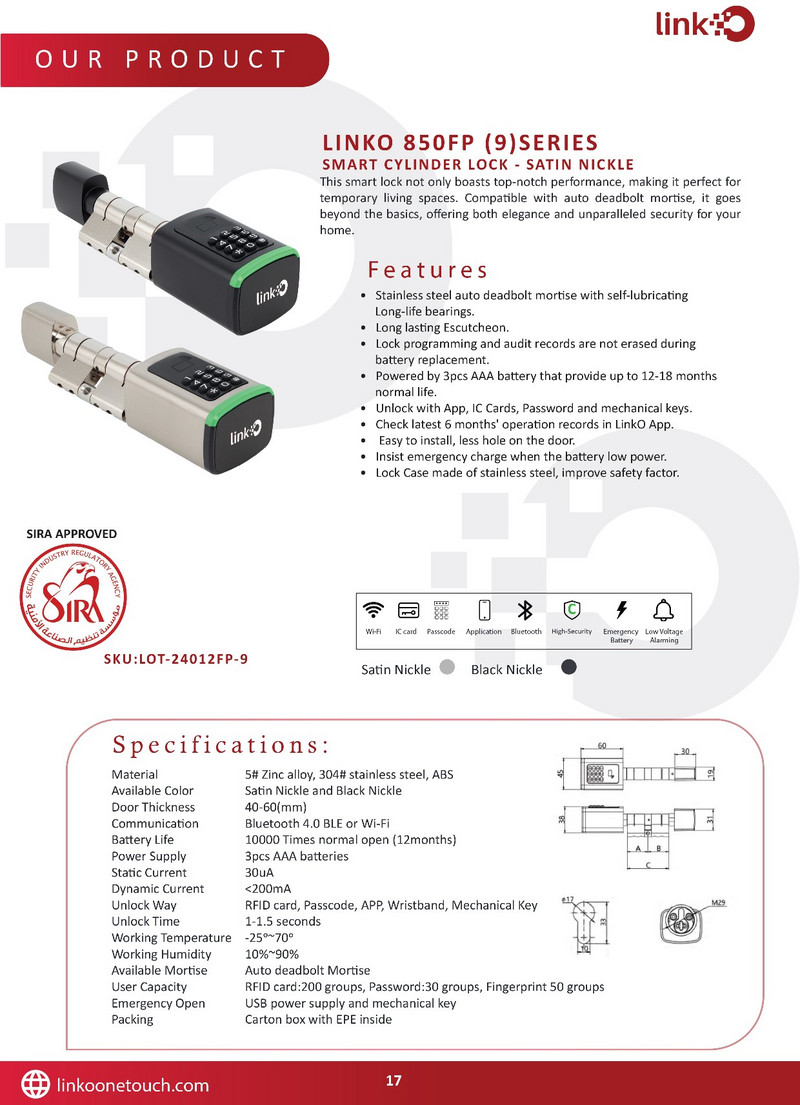 LINKO 850FP (9) SERIES - SMART CYLINDER LOCK - SATIN NICKLE